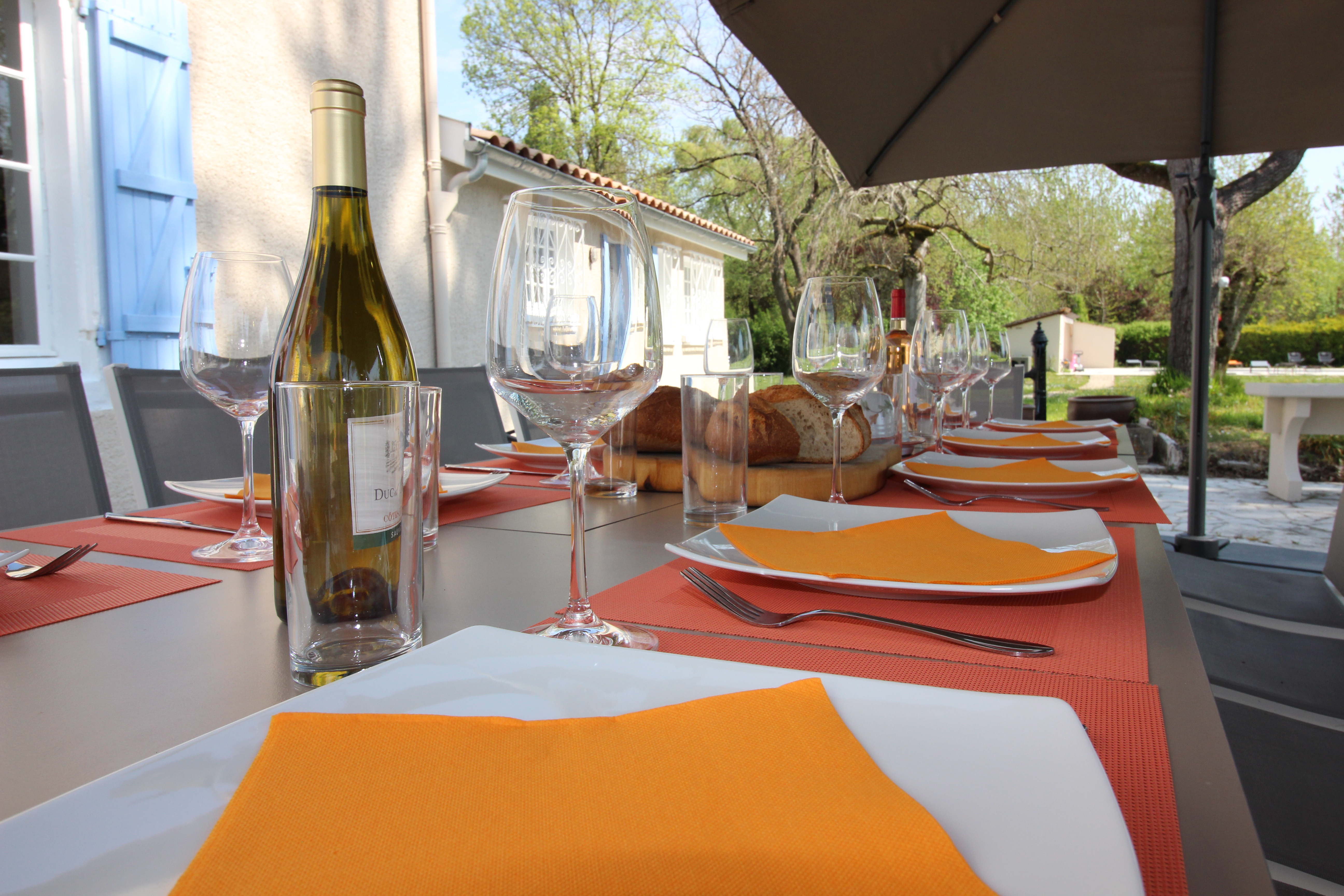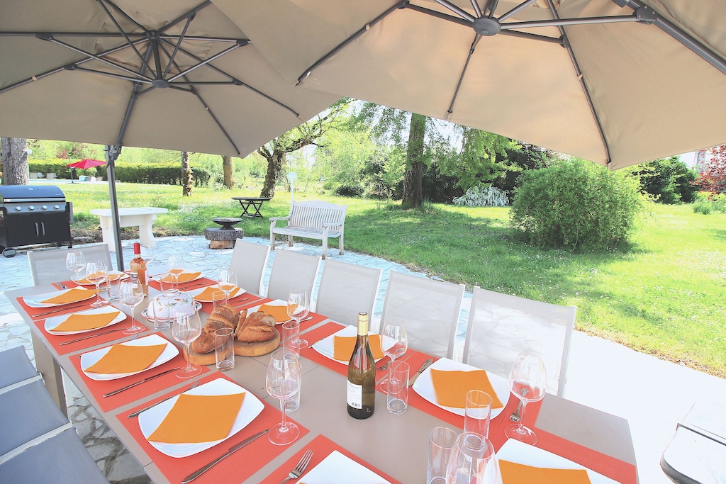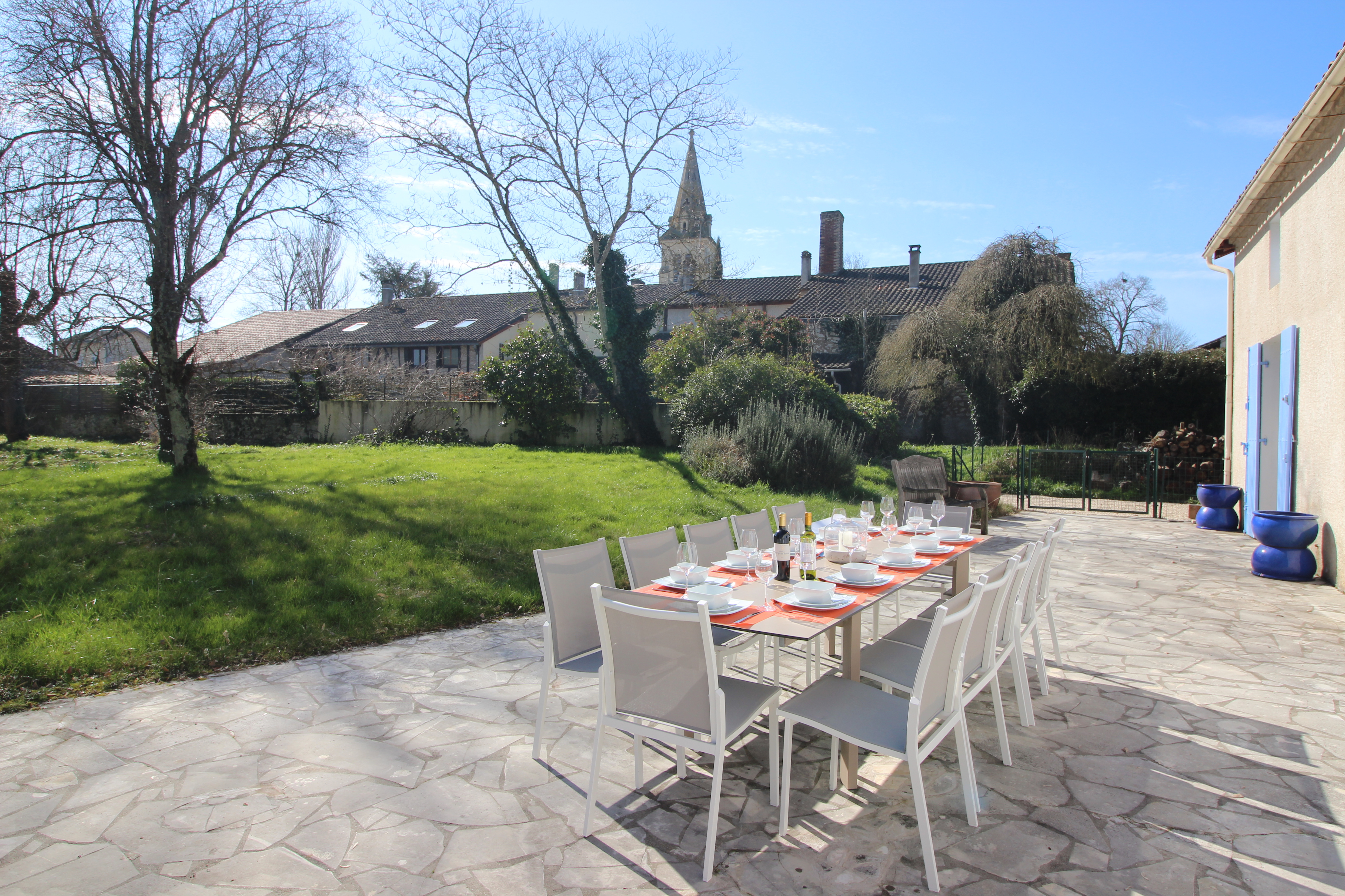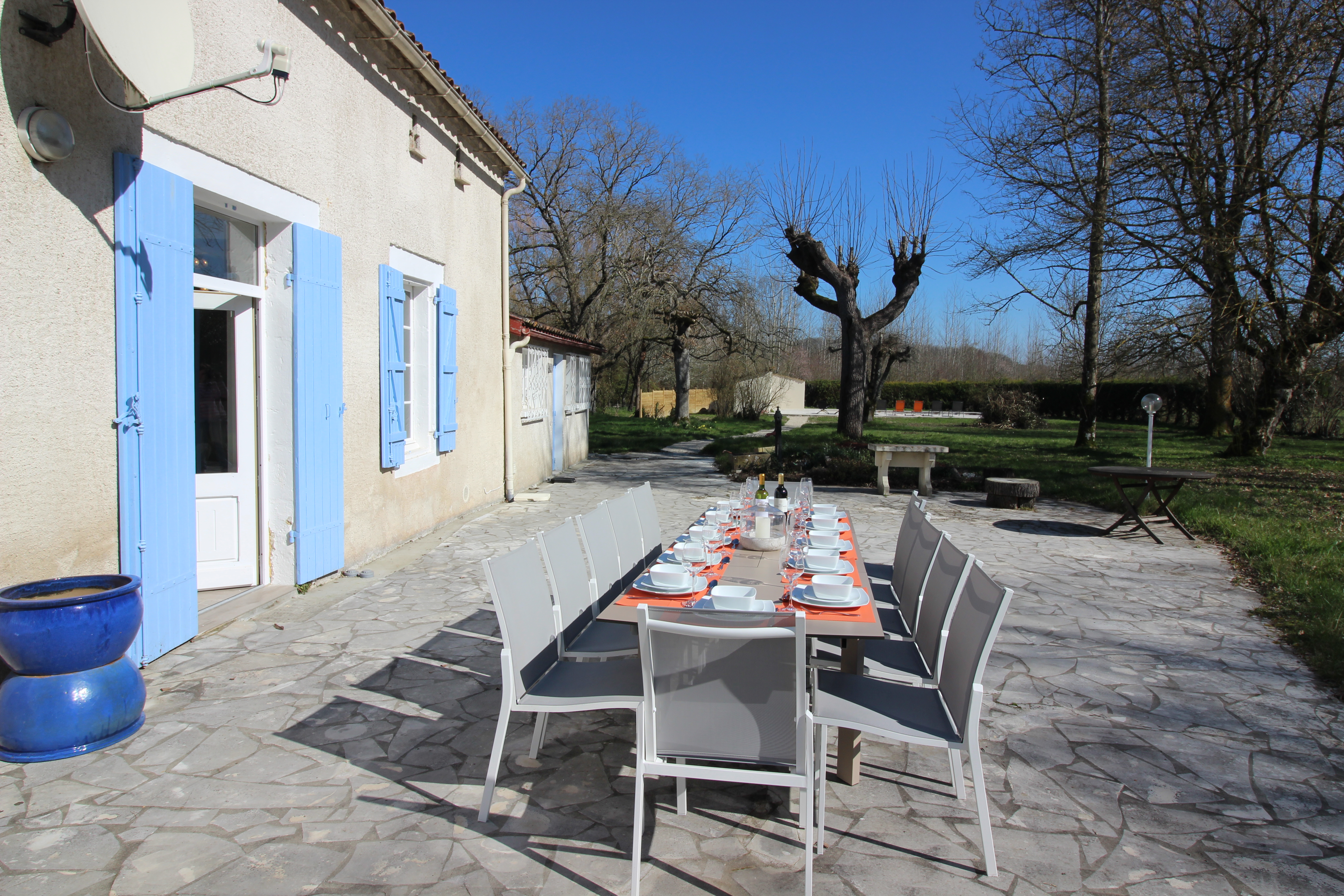Dining for 12 on the spacious terrace looking over the large garden at Les Arbres