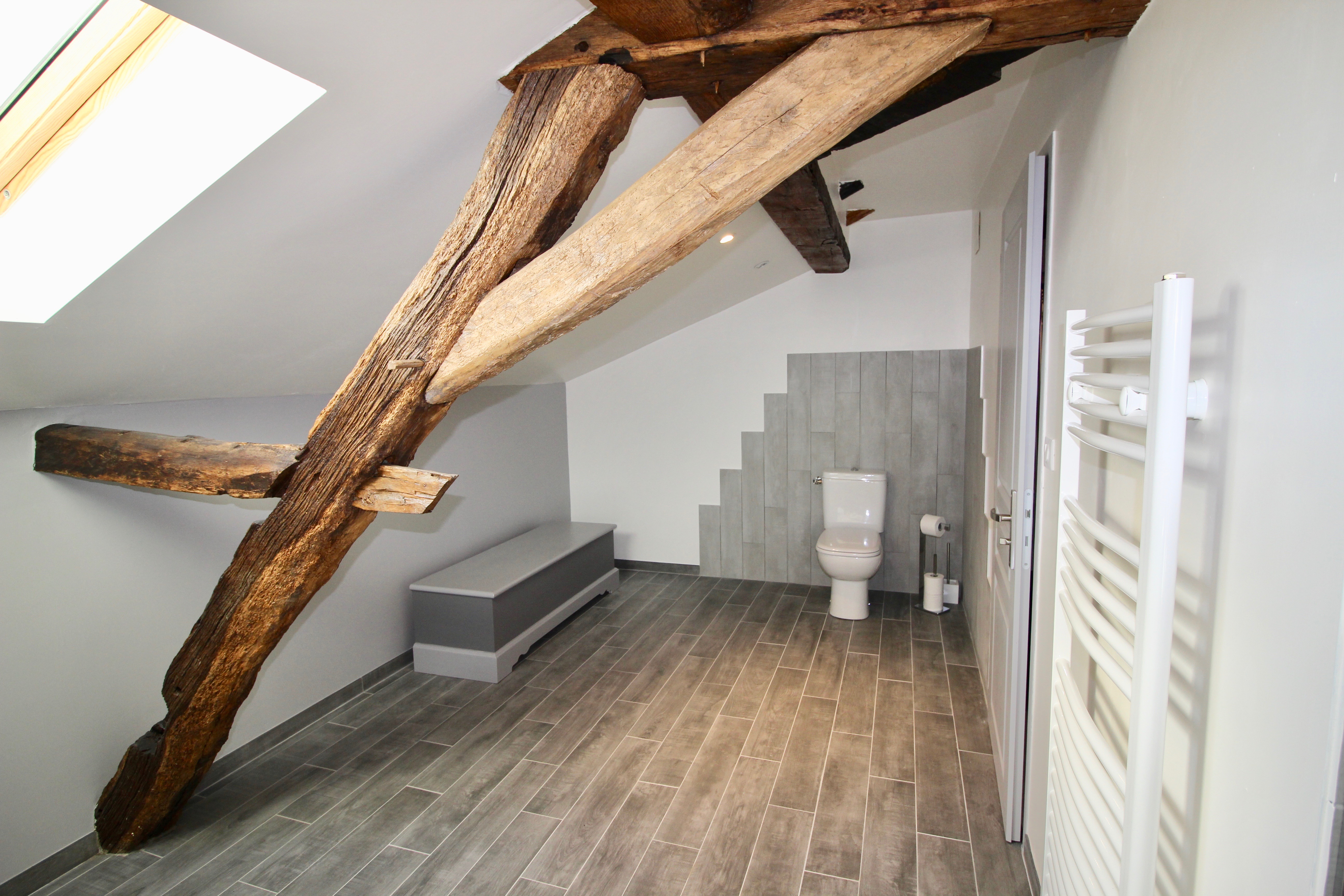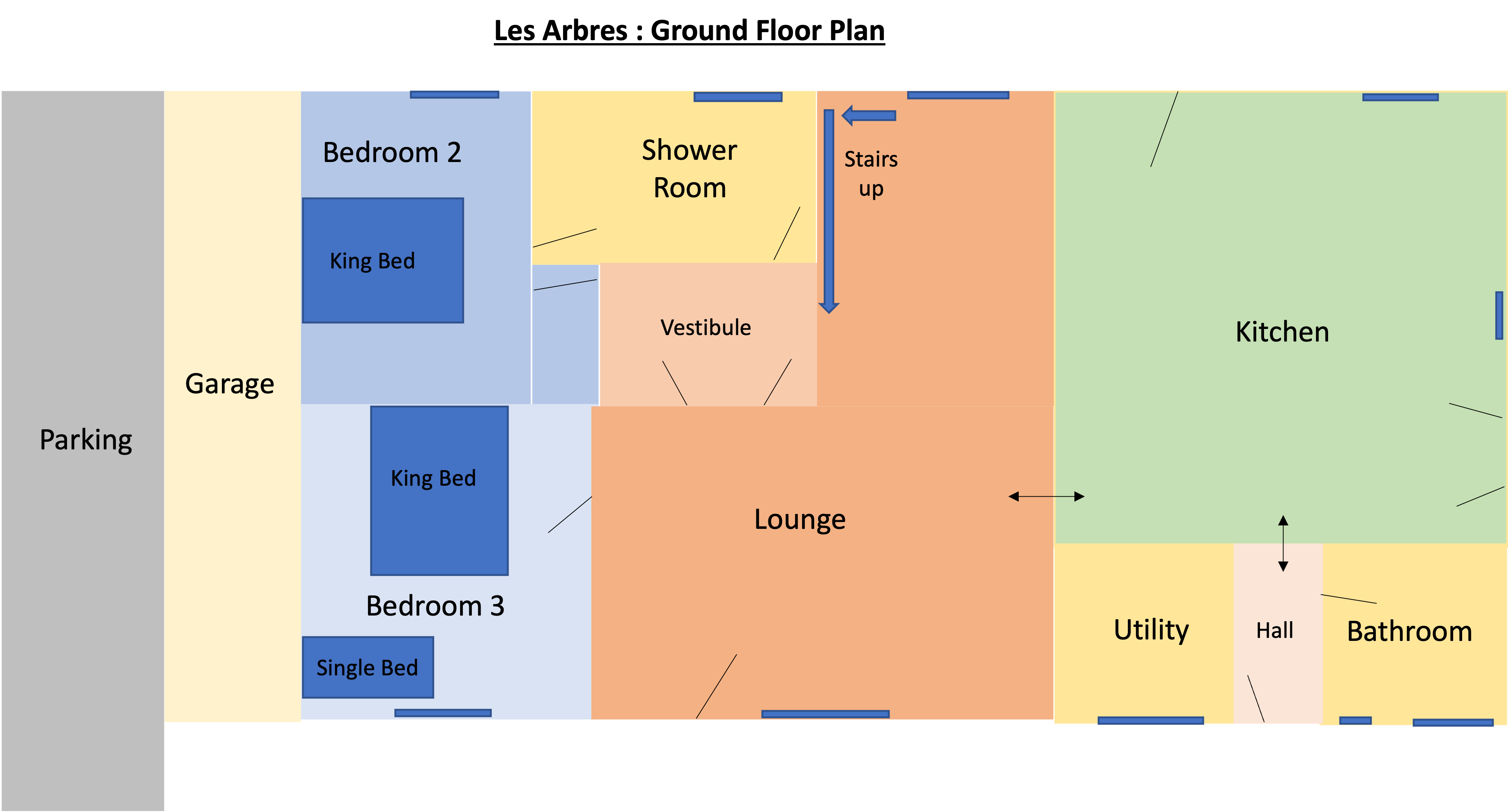 Steps from kitchen up to bathroom, utility, lounge, terrace and garden